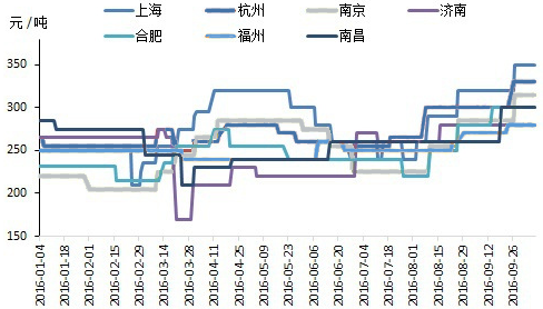 華東地區(qū)上半年對水泥熟料價格進行了四輪上調(diào),隨后價格逐漸趨穩(wěn)。進入梅雨季節(jié)后,市場需求萎縮,價格持續(xù)下行,尤其是長三角地區(qū),導(dǎo)致前期的上漲基本回吐。8月開始受G20影響大面積停工出現(xiàn),市場供應(yīng)下滑明顯,水泥價格實現(xiàn)整體大幅反彈。9月G20停窯限產(chǎn)影響逐漸消退,但除了山東市場因錯峰停窯價格暫穩(wěn)外,其他市場水泥價格整體繼續(xù)強勢上漲,預(yù)計此輪上漲期將持續(xù)至10月上旬。