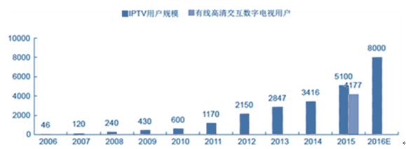 2006-2016年IPTV用戶規模與有線高清交互數字電視用戶(單位:萬戶)