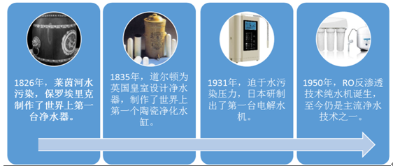 20 世紀 90 年代,凈水器已經進入中國市場,但是當時凈水器基本從國 外進口,售價較高,甚至上萬元,不能被百姓接受;90 年代末,國內 廠商開始嶄露頭角,結合飲水機,行業有了一定程度的擴張;21 世紀 初至今,凈水器技術發展已較為成熟,但市場魚龍混雜,凈化程度不 可見,以及居民習慣于飲用白開水等痛點阻礙著凈水器市場的進一步 發展。