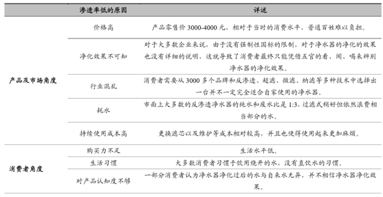 2)消費者的飲水習慣。中國凈水器滲透率低于歐美日韓等發達國家主 要與居民的飲水習慣有關。歐美日韓等國家居民在直飲水的接受程度 上遠高于中國,而中國居民更習慣飲用燒開過的水,許多人依然無法 接受以及信任經過凈水器處理的自來水并直接飲用,這樣就大大影響 了凈水器在中國的普及。