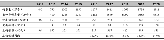 以 2012-2014 年的銷量總數 3402 萬臺作為市場存量數據,以均價 2000 元估算增量市場;同時,估算配件更換市場,假設反滲透膜等核心配 件更換周期 2-3 年,價格 200 元,活性炭和 PP 棉更換周期 6-12 月,價格 100 元,每年每臺凈水器更換配件花費在 180 元左右。凈 水器更新換代,約 8 年,在未來 3 年內不會出現大規模設備的更新換代。假設農村家庭洗碗機的滲透率保持 0,但是隨著人均可支配收入的提高,農村市場的滲透率也會隨著增長。