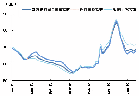 2016年以來,受外圍市場影響,鋼價從年初開始便一路飆升,在4月底達到價格高點,之后出現下跌并逐步趨于平穩。中國鋼鐵業協會統計數據顯示,截止2016年6月底,國內鋼材綜合價格指數為68.69,較2016年5月底下降1.28點,較去年同期上升2點;長材價格指數為67.8點,較2016年5月底下降0.39點,較去年同期上升4.27點;板材價格指數為71.59點,較2016年5月底下降1.92點,較去年同期上升4.27點。