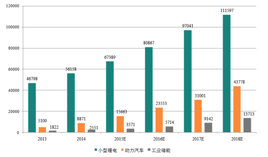 核心提示:2013 年以來,全球鋰電用電量持續增長,2013 年全球總鋰電用電量為53,720MWh,預計 2018 年將達 169,088MWh。鋰電需求市場大致可以分為三類:小型鋰電、動力汽車、工業儲能。其中小型鋰電占主要地位,但動力汽車的鋰電需2013 年以來,全球鋰電用電量持續增長,2013 年全球總鋰電用電量為53,720MWh,預計 2018 年將達 169,088MWh。鋰電需求市場大致可以分為三類:小型鋰電、動力汽車、工業儲能。其中小型鋰電占主要地位,但動力汽車的鋰電需求增長迅速,且對鋰電池的要求更高,未來具有更大的潛力和盈利空間。