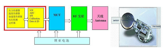 其中核心部件壓力傳感器主要有硅集成電容式壓力傳感器(如Freescale 的MPXY8020、MPXY8040)和硅壓阻式壓力傳感器(如GE NovaSensor 的NPX1、NPXC01746,Infineon SensoNor 的SP12、SP12T、SP30)。而一個SoC 模塊內部典型架構包括壓力傳感器、溫度傳感器、加速度計、電池電壓檢測、內部時鐘和一個包含ADC、取樣/保持、SPI 口、校準、數據管理以及ID 碼的數字信號處理單元,其測量精度能達0.01~0.03%FS。為了便于TPMS 接收器的識別, 每個壓力傳感器都具有32 位獨特的ID 碼,可產生4 億個不重復的號碼。