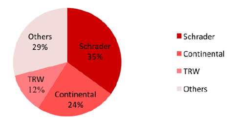 全球TPMS 制造商主要包括Schrader(喜萊德)、Pacific Industrial(太平洋工業)、Continental(大陸集團)、TRW (天合)、BorgWarner(博格華納)等。