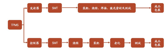 Soc 芯片供應商主要以英飛凌、飛思卡爾為主,配套封測廠商以日月光、Amkor 為主。而類似Schrader 這些TPMS生產廠商則外購芯片、鋰電池,然后經過SMT 貼片,裝配、封測等工藝后向下游汽車廠商銷售。