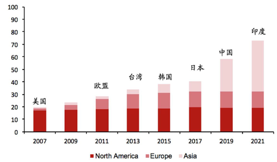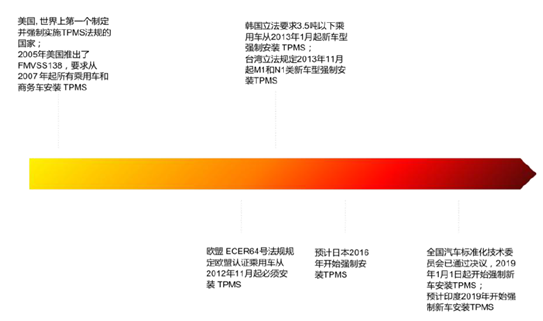 國際上,最早在1997 年,通用汽車開始使用間接式TPMS,大規模引起重視是在2000 年由于Firestone 的輪胎質量問題導致的數千人傷亡,由此美國批準TREAD 法案開始對于強制性TPMS 安裝的討論。 美國作為全球第一個強制安裝胎壓監測系統的國家,當時給出的執行時間表是:2004 年占10%,2005 年占35%,2006 年占65%,2007 年將達100%。歐盟也立法規定從2014 年11 月1 日起所有新乘用車必須安裝TPMS。在亞洲地區,韓國、臺灣等已采取類似立法的程序。韓國在2012 年通報“韓國機動車輛安全標準執行法規”修訂案,日本的JASO 也制定了一項TPMS 實車測試方法的技術文件。而中國也即將推出強制性法規,預計在2019 年1 月1 日起開始強制新車安裝TPMS。