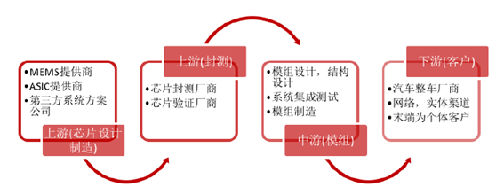 我們按照TPMS 的上下游來進行分解,上游以MEMS 提供商、ASIC 提供商以及第三方系統方案公司以及封測廠商為主,中游則是模組設計、結構設計的系統集成商為主,而下游則直接面對汽車整車廠商和個人(后裝市場)。