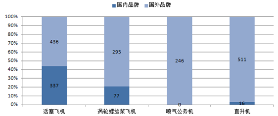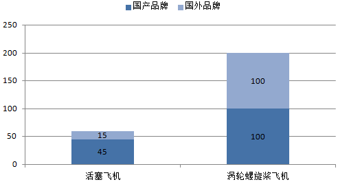 當(dāng)前我國(guó)國(guó)內(nèi)通用飛行器的產(chǎn)品和機(jī)型種類較少,以活塞飛機(jī)為主。2014年我國(guó)在冊(cè)通用航空固定翼飛機(jī)為1403架,其中活塞飛機(jī)773架,噴氣機(jī)246架,渦輪螺旋槳飛機(jī)372架。在活塞飛機(jī)中國(guó)產(chǎn)品牌占比最高,為43.6%,渦輪螺旋槳飛機(jī)中國(guó)產(chǎn)品牌占比為20.7%,噴氣公務(wù)機(jī)則被國(guó)外品牌壟斷。