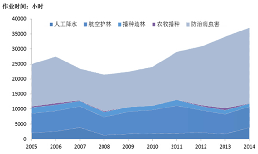 農(nóng)林作業(yè)方面,植保類農(nóng)林作業(yè)(包括航空護(hù)林和防治病蟲害)占作業(yè)總時(shí)間比例約為86%,2014年我國(guó)農(nóng)林植保作業(yè)時(shí)間為32046小時(shí),同比增速為6.13%。考慮我國(guó)為農(nóng)業(yè)大國(guó),農(nóng)業(yè)耕地面積較大,隨著通用航空技術(shù)在農(nóng)業(yè)植保中的滲透率增加,農(nóng)業(yè)植保的作業(yè)規(guī)模有望大大增加。