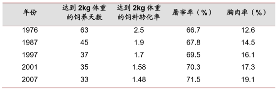 根據美國農業部對美國畜禽牧業生產中各項因素所起作用的 精確計算,品種改良以 36%的影響占比居于首位。據 USDA 統計,2016 年全球雞肉產 量為 8965 萬噸,以 1.5:1 的飼料轉化率計算,轉化率每提高 1%,可以節約 134 萬噸 飼料。每生產 1 只(2.3 公斤)白羽商品肉雞,比生產同等重量的豬肉節約糧食 2.73 公斤;比同等重量的黃羽肉雞節約糧食 1.95 公斤。