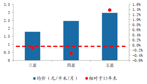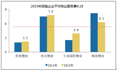 2015年百強企業的管理項目平均物業費為4.23元/平米,與2014年基本持平,各業態除商業物業之外,與14年相比均有不同水平的提升(見圖5)。從城市分布情況來看,一線城市平均物業費為6.51元/平米,二線和三線城市分別為3.89元/平米和3.5元/平米。