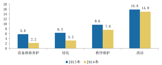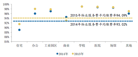 不同檔次的物業服務來看,中低端服務價格有所下降,二十大城市三星、四星級物業服務均價較15年底分別下降了0.13%和0.32%,而高端五星級物業則上漲了1.37%。隨著消費觀念的升級和對于服務水平及要求的提升,業主對于高品質服務的價格接受程度提升,而中低端服務的議價能力則在下降。2014-2015年百強企業物業服務費收繳情況