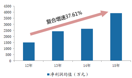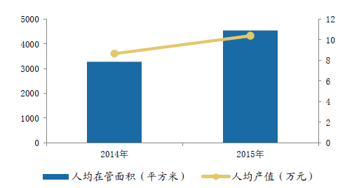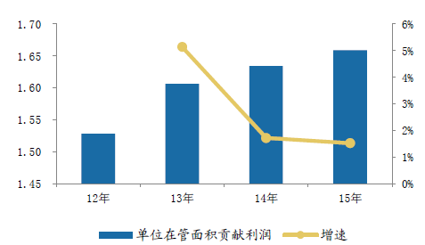 行業盈利能力方面,15年百強企業凈利潤總值82.26億元,盈利規模持續擴大;均值為3916.93萬元,同比增長48.99%,12年至15年復合增長率達到37.61%。百強企業15年平均凈利潤率為7.43%,同比增長1.24個百分點。企業單位管理面積凈利潤貢獻效率方面來看,15年百強企業平均在管面積凈利潤貢獻規模為1.66元/平米,與14年相比提升0.03元,增速為1.5%。