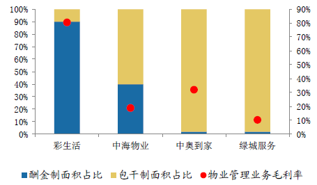 住宅物業管理公司的收入方式分為包干制和酬金制兩種,其中包干制是指物業管理企業收取固定物業服務費用,在支付物業服務成本之后盈余或者虧損均由物業管理企業所有或者承擔;酬金制是指物業管理企業按物業服務協議約定的比例或數額從物業管理服務費用,其余物業服務成本和費用由業主承擔。兩種收入方式的利潤核定方式不同,包干制是寬口徑收取所有的物業費,再由物業公司承擔管理支出成本因此毛利率水平較低;而酬金制的收入不考慮成本和費用支出,收入金額即為營業利潤,毛利率為100%。