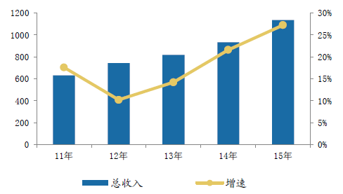 2011-2015年中國百強企業物業管理收入(億元)及增速
