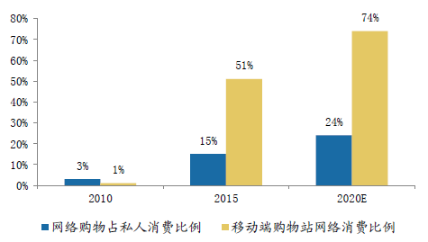富裕階層家庭單位消費意愿較強,與過去經濟增長帶來的消費能力普漲不同,高級階層的出現將會帶來單位收入增長后的消費比例提升。80、90、00等年輕一代消費者在人口結構中的占比將從當前的40%,發展到2020年將會提升至46%,由于生長環境的變化使得年青一代的消費意愿更強,而儲蓄率將會下降,由此帶來消費市場的增長;網絡購物對于消費市場的影響主要體現在增加消費意愿,同時拉平了城市之間的市場差異,提升了各基層的交易成功率。