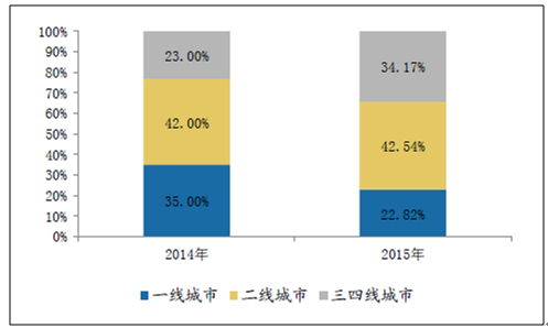 盡管行業而整體集中度依舊偏低,但百強房企成長以及市場占有率的增長速度高于行業平均水平。15年 百強企業管理面積總值達到49.59億平米,占全國物業管理面積的28.42%,較14年提升8.92個百分點,行業集中度提升趨勢顯著。15年百強企業管理面積均值為2361.5萬方,同比增長46.76%,連續三年復合增長率達到34%。Top10企業管理面積均值達到1.33億平方米,同比上漲74.5%,領先優勢進一步增大。城市布局方面,百強企業在一線城市管理項目占比為22.82%,二線城市管理項目占比最高達到42.54%,三線城市占比達到34.17%,與14年相比由于納入統計口徑的公司數量增加,三線城市占比有所提升。