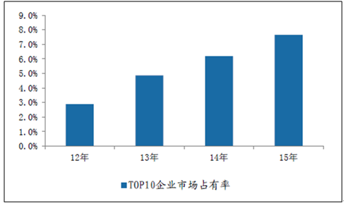 通過近些年的發展,物業管理行業的格局基本上已經形成,TOP10企業無論從通過成熟的管理模式以及品牌號召力取得了高于行業平均水平的增長。但目前行業集中度依舊偏低,截止到2015年TOP10企業市場占有率僅為7.64%,與14年相比增長1.5個百分點。在管面積能夠直接反應企業真實的業務水平和市場地位,伴隨著資本的進入以及技術的不斷更新,行業優勝劣汰加劇,12-15年TOP10企業市場占有率年復合增速達到38.5%,超過百強企業同期年復合增長率10.44個百分點。