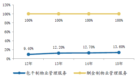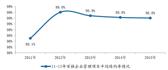 客戶黏性方面,15年百強物業服務費平均收繳率為94.09%,比14年上漲1.07個百分點,其中住宅物業的收繳率最低僅為91.3%,與14年相比上升1.91個百分點,其他物業形式中商業物業是收繳率唯一降低的類型。續約率方面,15年百強企業管理項目平均續約率為98.8%,11年以來平均續約率都保持在98%以上。優秀物業公司良好的行業口碑是客戶維持較高黏性的重要保證。