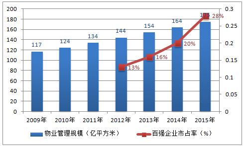 2009-2015年全國物業管理面積及百強企業市場占有率