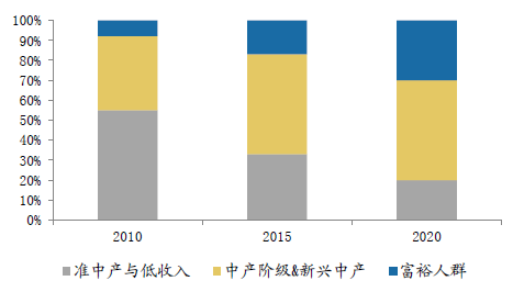 盡管中國GDP增速有所放緩,但未來消費市場仍有驚人的增長空間,即使中國的實際GDP增速進一步放緩至5.5%,到2020年消費市場規模仍將擴大50%,約2.3萬億美元,總市場規模將會達到6.5萬億。由于經濟增長的放緩,主要推動消費市場規模增加的原因將有所變化,消費結構的調整以及消費觀念的變化將成為構筑市場增量的主導。上層中產及富裕階層消費者、新世代消費者及網絡消費是在整體市場格局結構里面增長幅度較快的部分。