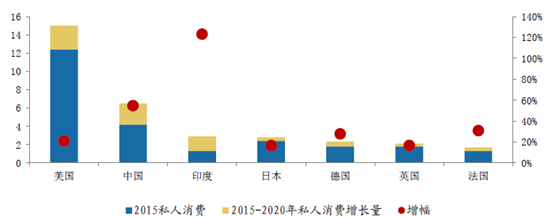 全球主要國家2015-2020年消費市場規模(萬億美金)變化