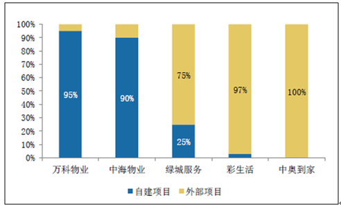 而獨立物業企業所管理項目通過并購或托管其他開發商的項目,通過專業化的管理策略和開發商簽訂合作協議。一方面為開發商減少銷售后的物業管理壓力,另一方面可以通過整體委托的方式獲得受托規模的快速增長。與關聯開發企業項目,獨立公司通過第三方的身份,對于銷售企業而言不會產生品牌侵蝕,和中小房地產開發企業比較容易產生合作關系,有利于規模的快速擴張。在已經上市或排名靠前的企業中,彩生活和中奧以外部項目為主,而萬科、中海等以自有項目為主。