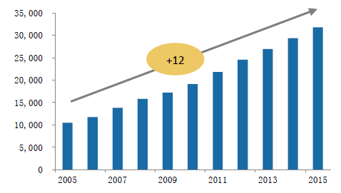 2005-2015年城鎮居民家庭人均可支配收入變化