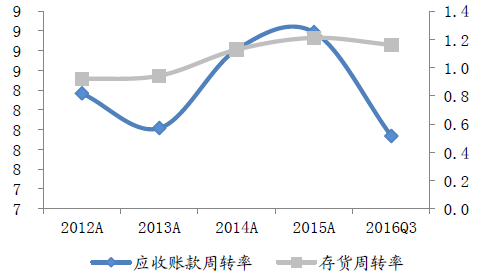 2012-2016年品牌服飾業(yè)歷年應(yīng)收賬款、存貨周轉(zhuǎn)率(次)