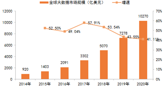 全球大數(shù)據(jù)產(chǎn)業(yè)市場(chǎng)規(guī)模 2014-2020 年間 CAGR 高達(dá) 49%