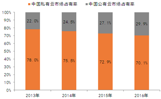 2013-2016 年我國(guó)私有云市場(chǎng)在我國(guó)云計(jì)算市 場(chǎng)占比均超過(guò) 70%
