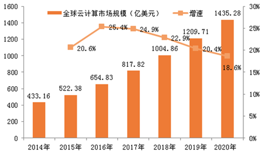 全球云計(jì)算市場(chǎng)規(guī)模2014-2020年間CAGR 為 22%