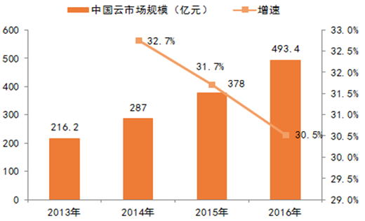 我國(guó)云計(jì)算市場(chǎng)規(guī)模2013-2016年間CAGR 為 32%