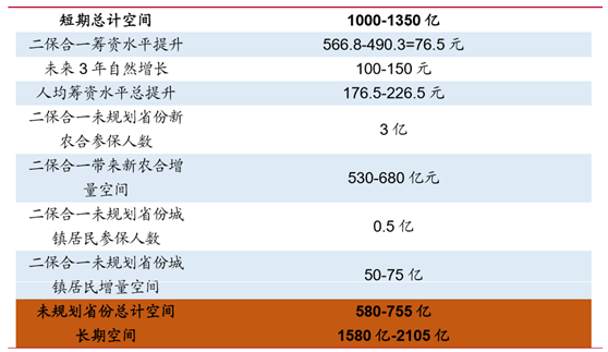 而籌資水平的提高,也會帶來二保合一完成和進程中省份的城鎮居民保險的增量空 間 300-450 億。故而短期二保合一的短期空間增量為 1000-1350 億。