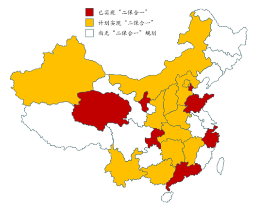 截至 2016 年 9 月,國內已經有包括上海市、天津市、浙江省、山東省等 8 個省、 自治區和直轄市已經完成了醫保合并,包括河北、湖北、內蒙古、江西、新疆、北京 等 12 個省份明確制定了醫保合并的時間進度,剩余 11 個省份的政策還在醞釀中。 從執行上看,在實現城鄉居民醫保并軌的地區,絕大部分是由人力資源和社會保障部 門管理和經辦,但也有并軌到新農合系統的地區,如安徽省界首市、寧國市。
