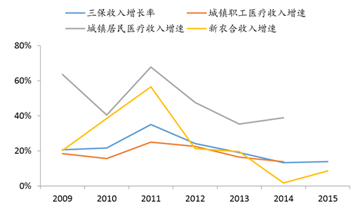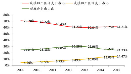 三保支出貢獻存在很大差異,2015 年城鎮職工醫保、城鎮居民醫保和新農合支出 分別為 7532 億、1780 億、2994 億,同比增長 12.47%、23.87%、3.57%。城鎮職 工醫保由于基數的增大,增長趨勢呈下降態勢;雖然我國 2015 年新農合實現了農村人 口基本全覆蓋,但是近幾年城鎮化進程的加快,新農合參與人數呈現下降趨勢,導致 新農合的支出增速呈現下降趨勢。