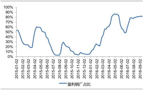 2016 年Q1-Q3 ,鋼廠盈利占比呈現觸底回升、高位斷崖式下跌而后逐漸攀升的局勢,與在第一部分分析的鋼價走勢類似。綜合鋼價指數從年初的74.56飆升至4月底的111.54,國內鋼廠盈利占比則從2016年1月初的7.36%上升到4月底的86.50%,盈利面擴大幅度高達79.14%;同比去年同期上升45.35%。之后鋼廠開啟復產浪潮,綜合鋼價指數也大幅回落20.00%,6月24日盈利鋼廠占比跌回至48.47%,7月、8月鋼市呈現“淡季不淡”的格局,鋼廠盈利占比在9月9日上升至82.21%,而后開始走低。