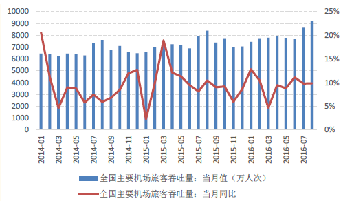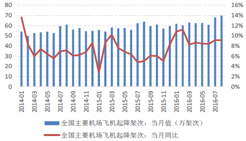 2016年8月份,全國主要機場旅客吞吐量為9219.03萬人次,同比增長9.86%;飛機起降架次為69.84萬架次,同比增長9.16%。