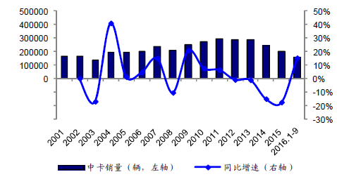 2001-2016年國內(nèi)中卡銷量及同比增速