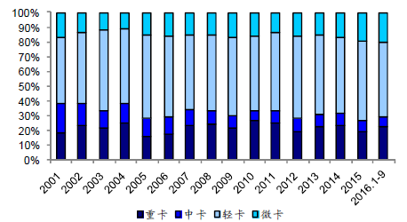2001-2016年國內(nèi)卡車銷量結(jié)構(gòu)