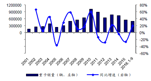 2001-2016年國內(nèi)卡車銷量及同比增速