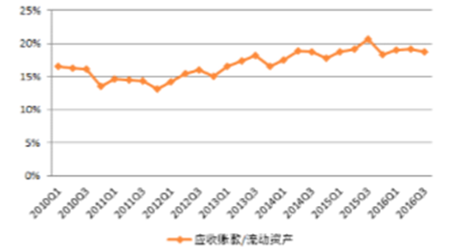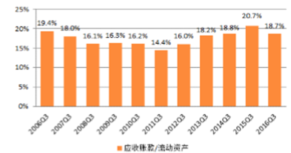 (五)存貨/流動資產:環比與同比均明顯下降,多數子行業下降存貨占比環比與同比均明顯下降。3季度末,行業存貨占流動資產比為22.7%,延續了2015年1季度以來的下降趨勢;與歷史同期比,目前行業存貨水平處于近年來最低位置,較去年三季度下降了3個百分點。