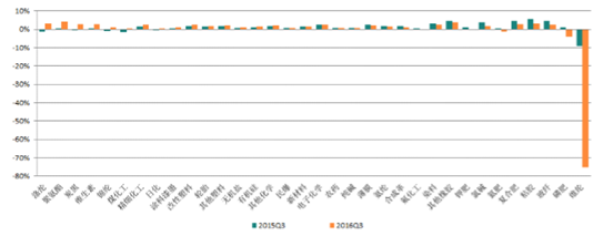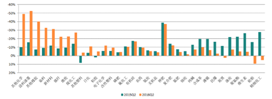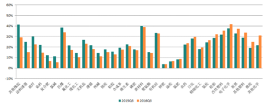 多數子行業收入增速較2016年2季度有所上升。2016年3季度,多數子行業營業收入同比增速較2016年2季度有所上升。其中,錦綸、煤化工、涂料漆墨、電子化學、聚氨酯、其他橡膠、滌綸、維生素等行業3季度收入增速提升較大,煤化工、炭黑、民爆、其他塑料、氨綸行業由負增長轉為正增長,磷肥、氮肥、維綸行業盡管營業收入增速提升但仍為負增長;鉀肥、復合肥、新材料等行業收入同比增速3季度比2016年2季度下降較多。