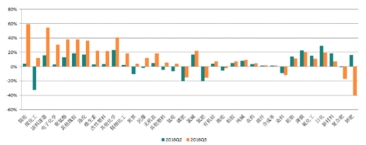 子行業毛利率過半數有所下降。2016年3季度,過半數基礎化工子行業毛利率水平較2016年2季度有所下降。炭黑、聚氨酯、氯堿、氨綸、新材料行業毛利率環比上升明顯,鉀肥、電子化學、煤化工、玻纖、磷肥、氮肥等行業毛利率水平下降較多。