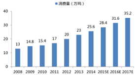 2013~2017年,我國 TPU制品消費量將保持 11.2% 的年均復合增速