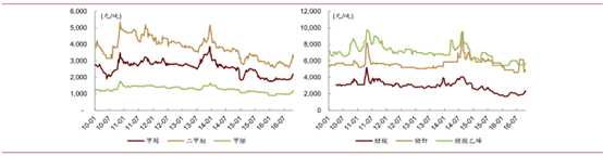MDI :純 MDI 跌 7.41%至 25,000 元/噸,聚 MDI 跌 1.08%至 18,300 元/噸;原料純苯價(jià)格維持在 5,400 元/噸,苯胺漲 3.75%至 8,300 元/噸。純 MDI:前期價(jià)格大幅上漲,下游對(duì)高價(jià)原料需求有限,市場(chǎng)逐漸回歸理性;聚 MDI:下游需求進(jìn)入淡季。
