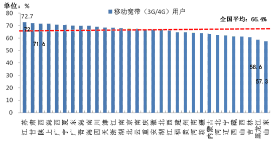 七個省份移動寬帶用戶占比超7成。8月末,東、中、西部地區移動寬帶(3G/4G)用戶分別比上年末凈增7156萬戶、4486萬戶、4599萬戶。西部地區的移動寬帶(3G/4G)用戶滲透率保持領先,達到68.1%,比東部和中部分別高出1.6、3.6個百分點。各省間移動寬帶(3G/4G)用戶占比差異依然較大,江蘇、甘肅、陜西、上海、廣西、寧夏和廣東分別居全國前七位,占比均超過70%。