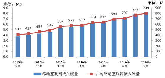 2015-2016年8月當月移動互聯網接入流量和戶均流量比較