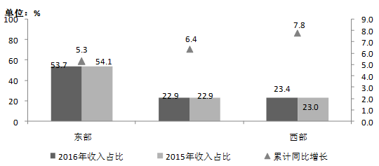 2016年1-8月東、中、西部電信業務收入增速和占比情況